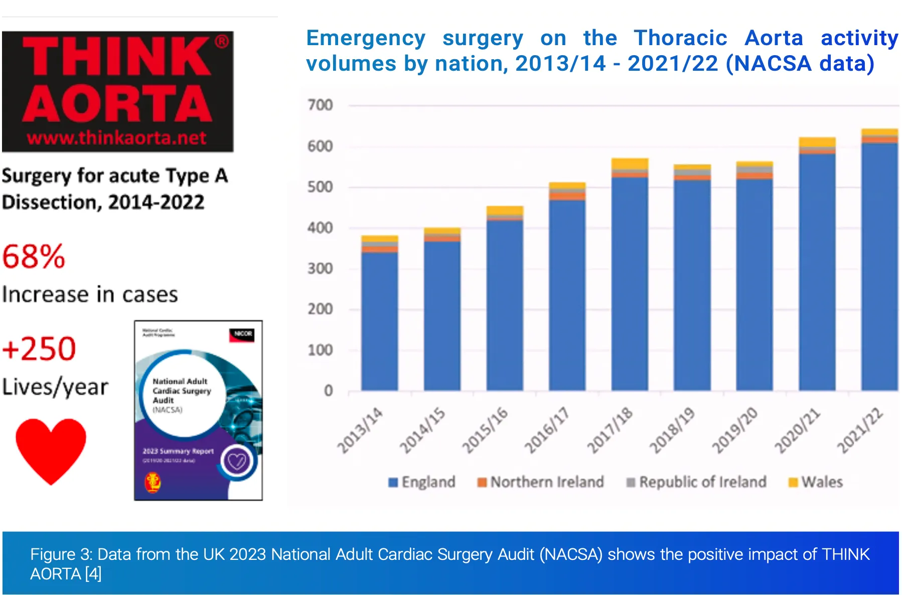 The 2023 NACSA data shows that, to date, THINK AORTA has addressed roughly 25% of the estimated UK deaths due to misdiagnosed aortic dissection. As a diagnostic strategy, THINK AORTA has professional endorsement from the Royal College of Emergency Medicine, the Royal College of Radiologists, the Society for Cardiothoracic Surgery, the Vascular Society, the Healthcare Safety Investigation Branch and Heart Research UK.